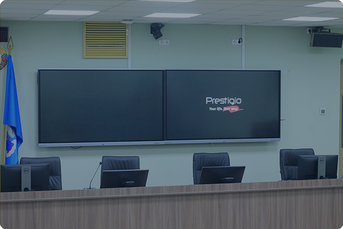 В качестве основного средства отображения информации в аудиториях были установлены интерактивные экраны Prestigio. Дополнительными инструментами показа данных выбран боковые ЖК панели LG диагональю 55 дюймов. Таким образом обеспечена гибкая подача различного контента на разные средства отображения. Например, на лекции для удобства теперь есть возможность вывести локальный контент на интерактивный экран, а удаленный контент на боковые ЖК панели.